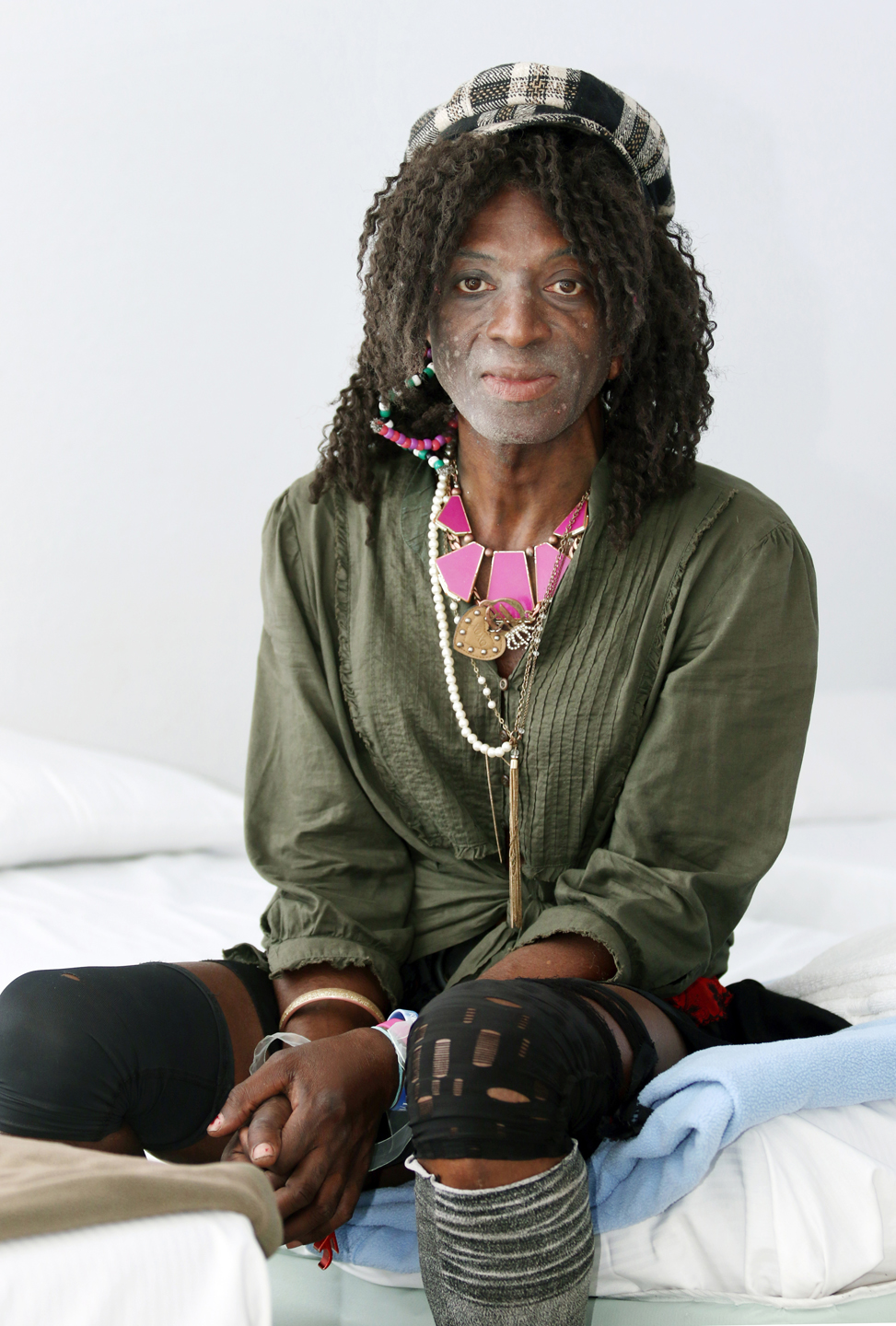 Colorful necklaces adorned his chest and bright beads were threaded on his long, curly hair. He wore torn tights, knee-high socks and furry high-heeled boots with little pompom tassels. His outward appearance was fun, funky and loud.