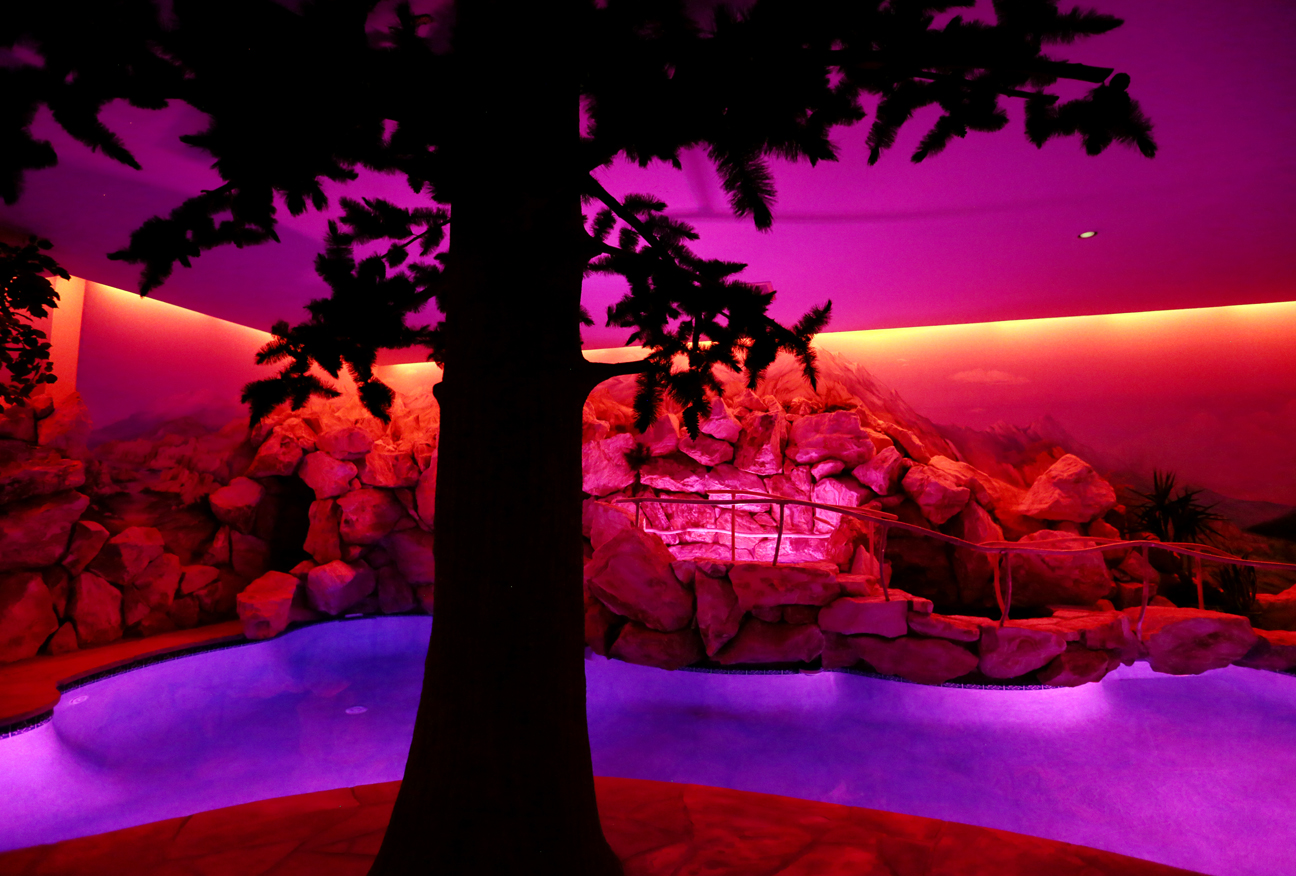 We envied the pull-from-the-wall toasters in the pink kitchen; a room that appeared to be from a 1950’s television show set. We bathed ourselves in fun while touring an elaborate master bathroom complete with lit tub that was surrounded by mirrors and even had ourselves a mini photo shoot (fully-clothed of course!). We even walked on a suspended Flintstones-like bridge over the in-ground (well it is all in ground) pool to view two separate little hot tub nooks.
