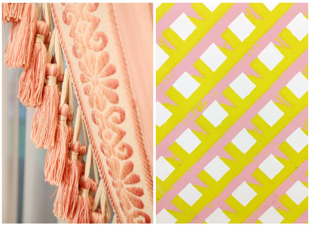 Detail of curtain in bedroom, detail of wallpaper in kitchen.