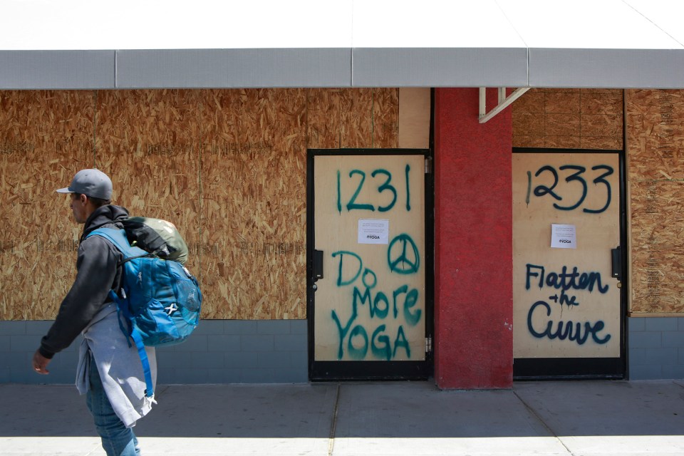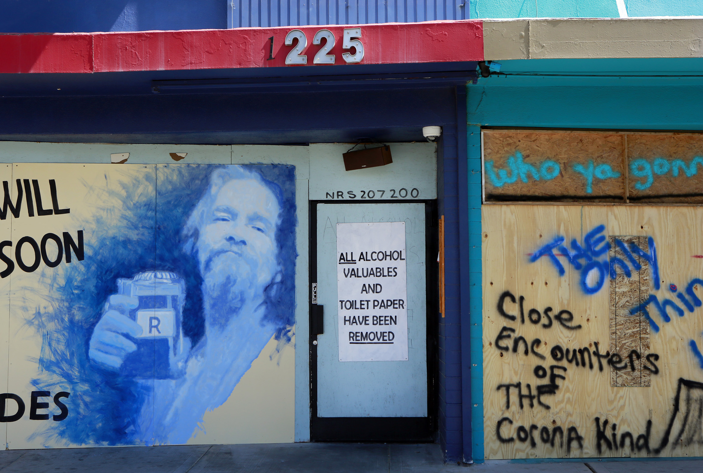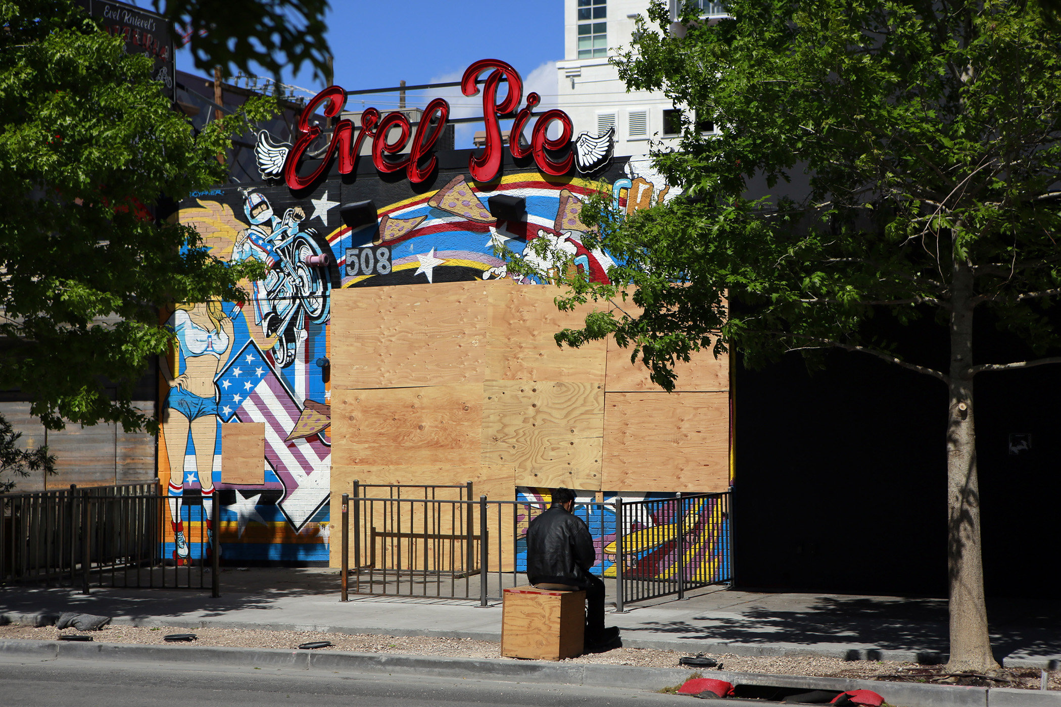The desolate downtown and Arts District are photographed on Day 10 of a statewide quarantine for COVID-19 in Las Vegas. The notorious Fremont Street Experience is closed off to pedestrian traffic and security guards stand by. Local artists have painted plywood that boards small businesses’ window fronts. Southern Nevada hunkers down for what I only fear is the beginning of the new normal.